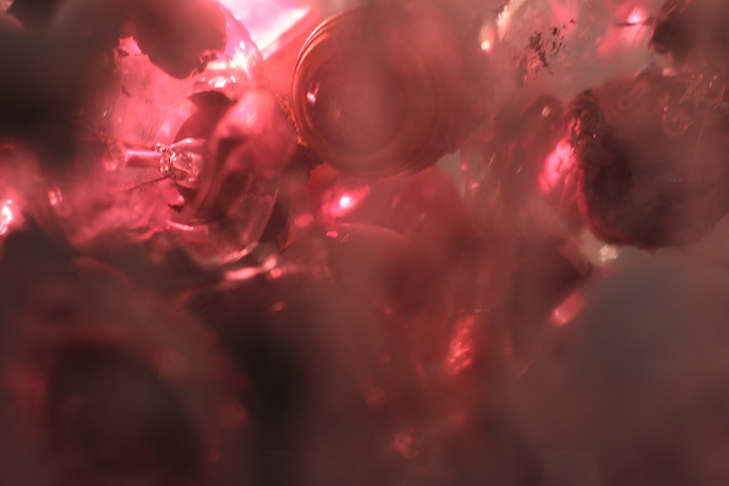 Für mich liegt die Verbindung in dem ganz plastischen Rahmen, der die Opernbühne als auch die Kanten meiner Bildkästen markiert. Er grenzt etwas von der „normalen“ Welt ab und macht es gleichzeitig dadurch exemplarisch. Beides funktioniert wie die klassische Guckkastenbühne, man betrachtet von vorne ein Spektakel, eine Illusion, die nie „Wirklichkeit“ sein will, sondern immer nur Abbild und Erfindung. Auch meine Kästen sind ja eine Verklebung unterschiedlichster Disziplinen, Malerei mit Objekt, Leuchtstoffröhre mit Plastikfolie, Partybechern und Kabeln.