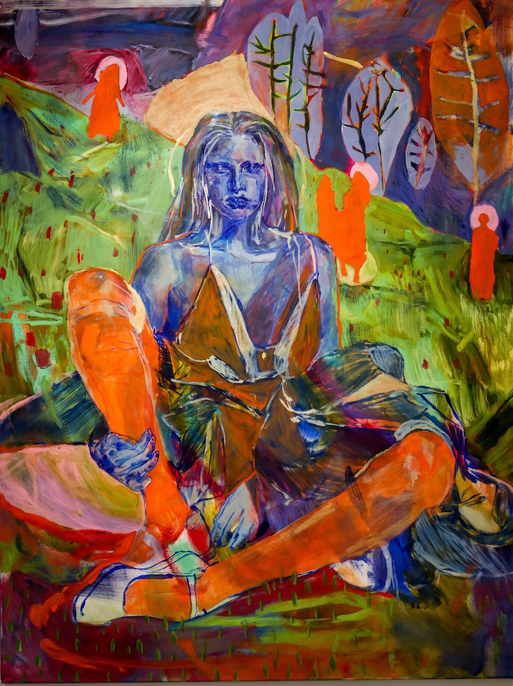 The women who gaze out from my paintings resist the male-constructed and conditioned ‚femme‘. Often androgynous, defiant, fragile, these women are the source of their own power. Each painting invites the viewer into a psychological landscape, a peripheral world. Little red figures float through several works, hovering between figuration and abstraction. They stand on the threshold, liminal, neither here nor there. The subject has the choice whether to surrender or to resist them.